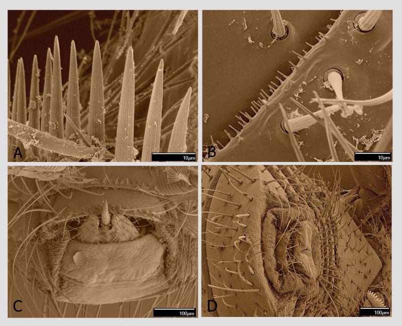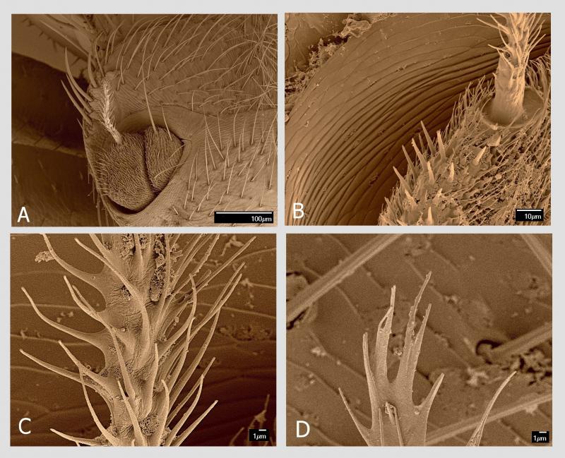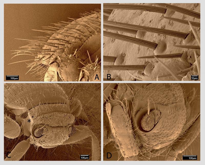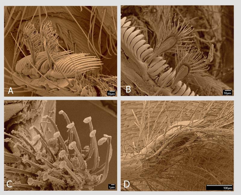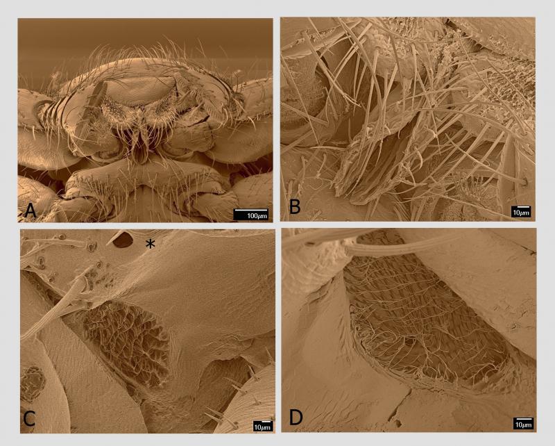 Při velkých zvětšeních, která umožňuje rastrovací elektronový mikroskop, jsem objevil specializovaný smyslový orgán na boku druhého hrudního článku mezi bází končetin druhého a třetího páru a průduchem. Samo kulaté až oválné stigma má délku 15–20 µm, přičemž na těle je jediný pár na tomto článku, pod povrchem průduchu je pak několik smyslových senzil. Specializovaný smyslový orgán je mělká jamka s nepravidelně oválným obvodem o průměru cca 100 μm hustě vyplněná jemnými smyslovými štětinkami o délce 10–15 µm s nevýraznou bází. Vzhledem k velikosti orgánu s mnoha desítkami senzil uvnitř lze předpokládat, že se jedná o významný smyslový orgán. Funkce je zatím neznámá.