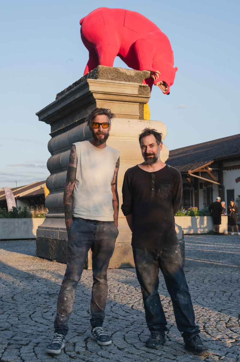 Obě figury jsou v přímém dialogu se sochami Mladíka s býkem alias Trhu a Muže s býkem alias Jatek, které vytvořili před 130 lety Vincenc Vosmík a Bohuslav Schnirch, a od té doby vítají návštěvníky u vchodu do tržnice. Nové sousoší bude stát v holešovickém areálu jeden rok.