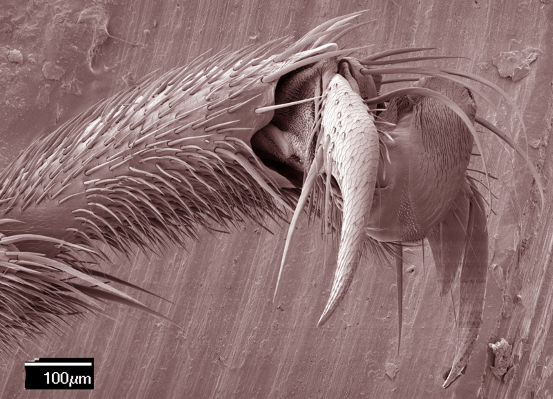 Na konci posledního článku chodidla (pretarsus) končetiny (zde končetiny třetího páru dělnice) včely medonosné (dělnice, matky, trubce) vidíme dva silné drápky. V článku uvidíte vše podrobně díky elektronovému mikroskopu.