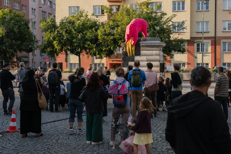 Včelí plástve drcené rumělkově červeným medvědem jsou od 11. září k vidění v Holešovické tržnici v Praze.